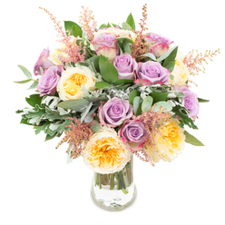 Discover the elegance and harmony of our hand-tied bouquet, featuring a delightful mix of pink and white roses enhanced by the subtle beauty of blue lisianthus. This arrangement is designed to captivate and inspire.