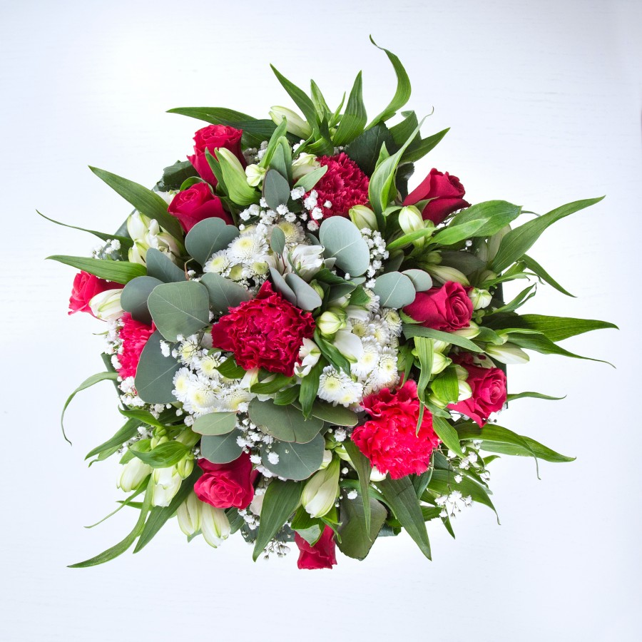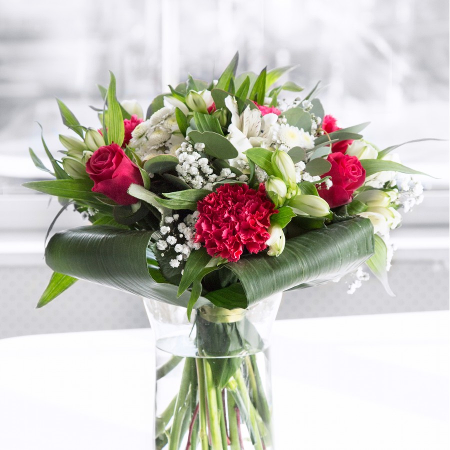 Embodying sophistication and charm, our Sophisticated Charm Bouquet features an elegant mix of white chrysanthemums, gypsophila, and red roses. Accented with carnations, white alstroemeria, and aspidistra leaves, this bouquet is a testament to high-quality craftsmanship and timeless beauty.